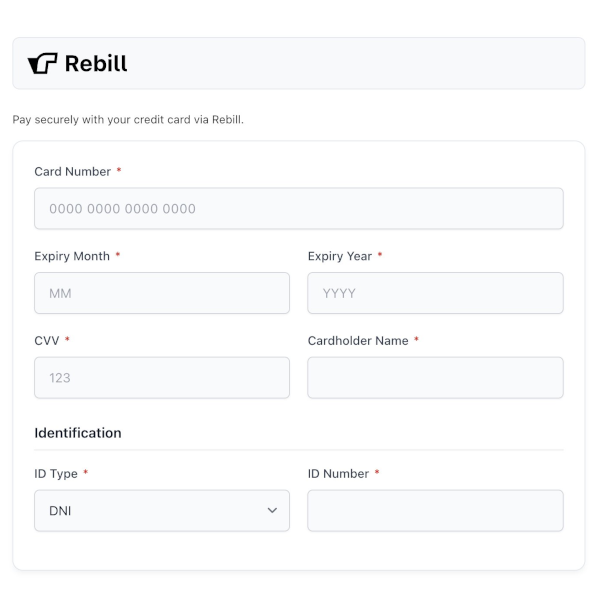 Conexión directa con la API v3 de Rebill para procesamiento seguro de pagos con tarjeta de crédito y débito en tiempo real.
